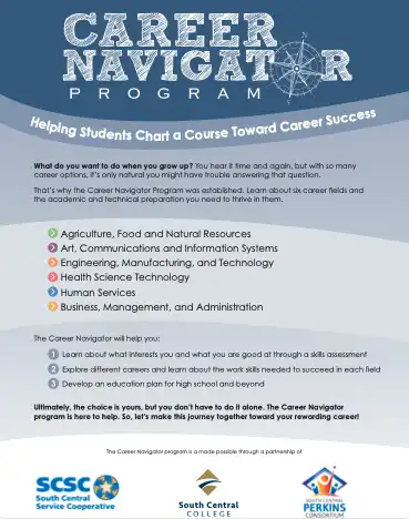 The Career Navigator is a program developed by SCSC—in partnership with South Central College and local industry professionals—providing high quality career information and content for 9th grade students across South Central Minnesota.