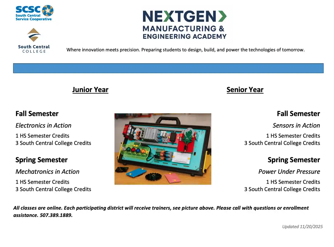 SCSC's NextGen Manufacturing & Engineering Academy introduces students to the advanced technologies shaping today’s manufacturing and engineering industries. Through engaging, hands-on learning and real-world applications, students explore electronics, automation, sensors, and fluid power systems that drive modern innovation.