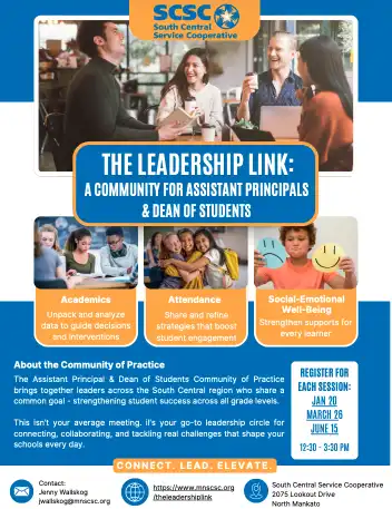 This Community of Practice brings together South Central region assistant principals and deans of students with a shared goal: to strengthen district-wide leadership in supporting students across all age groups. The focus of this community will center on addressing three core areas of student success—academics, attendance, and social-emotional well-being—with attention to the unique needs of learners at each developmental level.